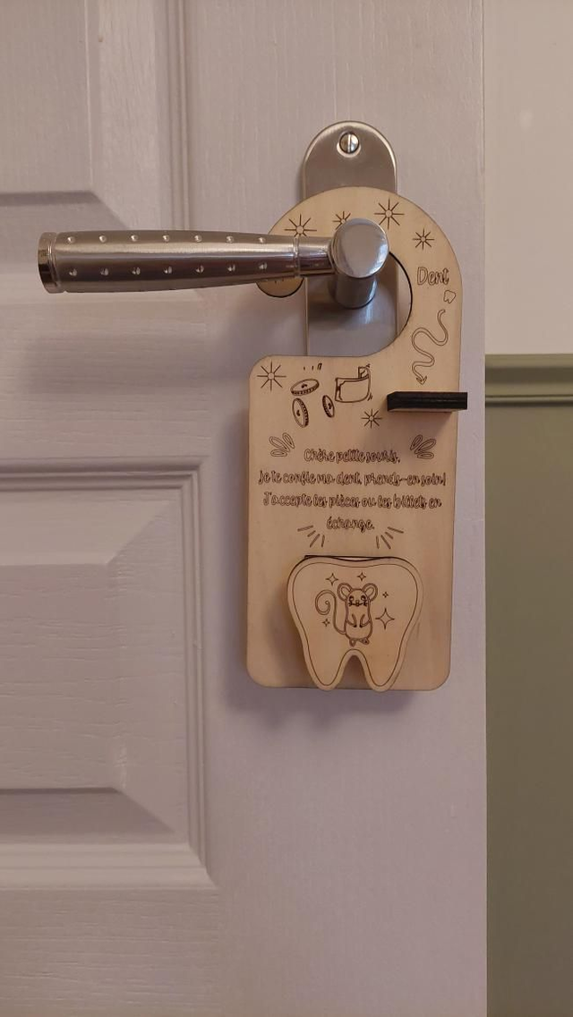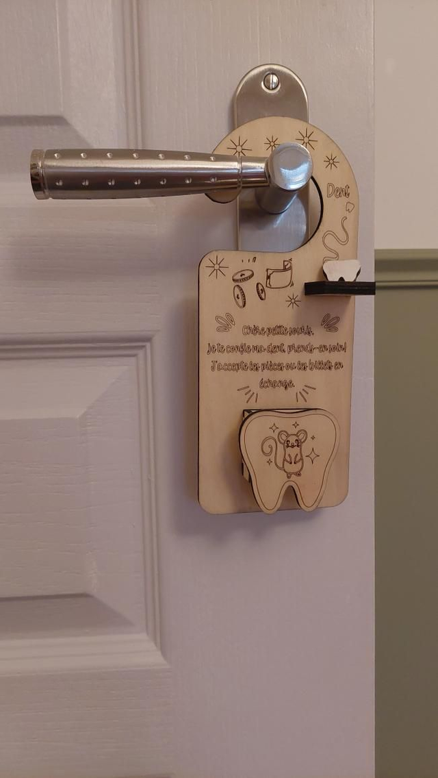 Gravée avec soin dans notre atelier Mika Laser, cette pancarte permet à l’enfant de déposer sa dent en toute confiance. La petite souris saura qu’elle peut passer pendant la nuit pour laisser une pièce ou un billet en échange, sans réveiller personne.